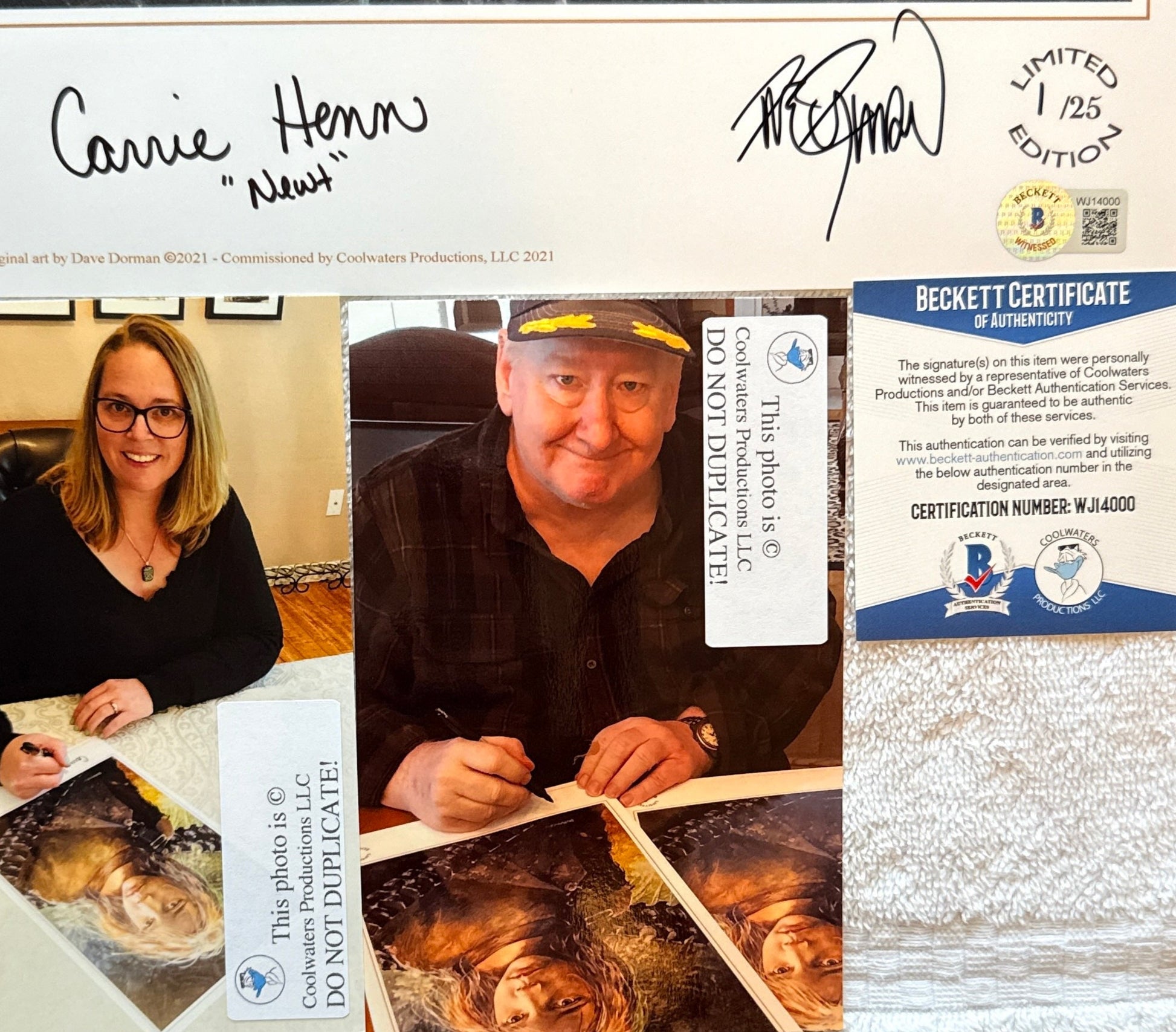 Autographs will be signed in fine tip black marker. A photo of both Ms. Henn and Mr. Dorman signing the prints will be included with your order.