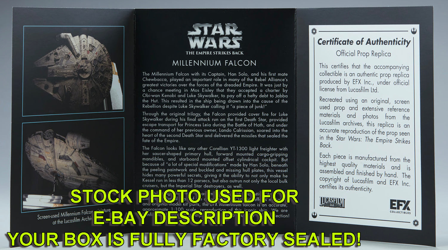 Collaborating with the Lucasfilm Museum of Narrative Arts Archives, and utilizing a digital scan of the actual surviving special effects miniature and original model kit parts, the EFX Millennium Falcon is an accurate approximate 1:100 scale reproduction of this iconic ship. We are confident that this will be a proud addition to your Star Wars collection!
