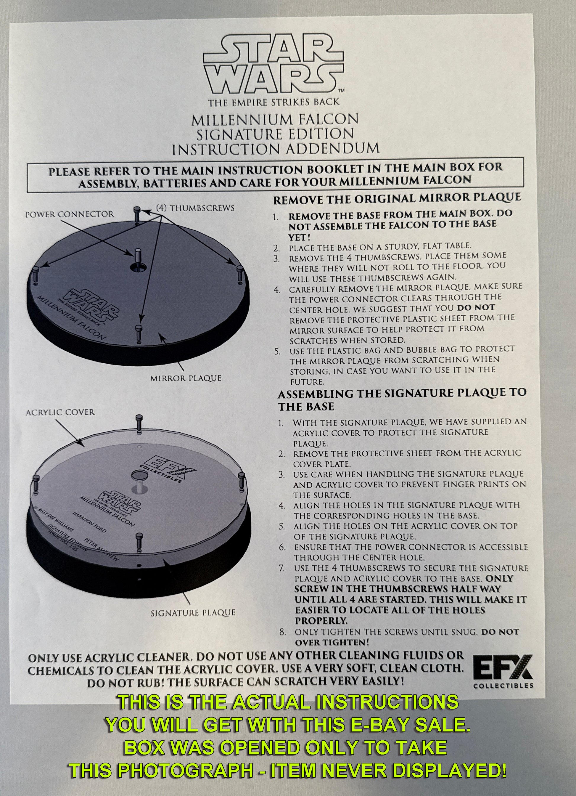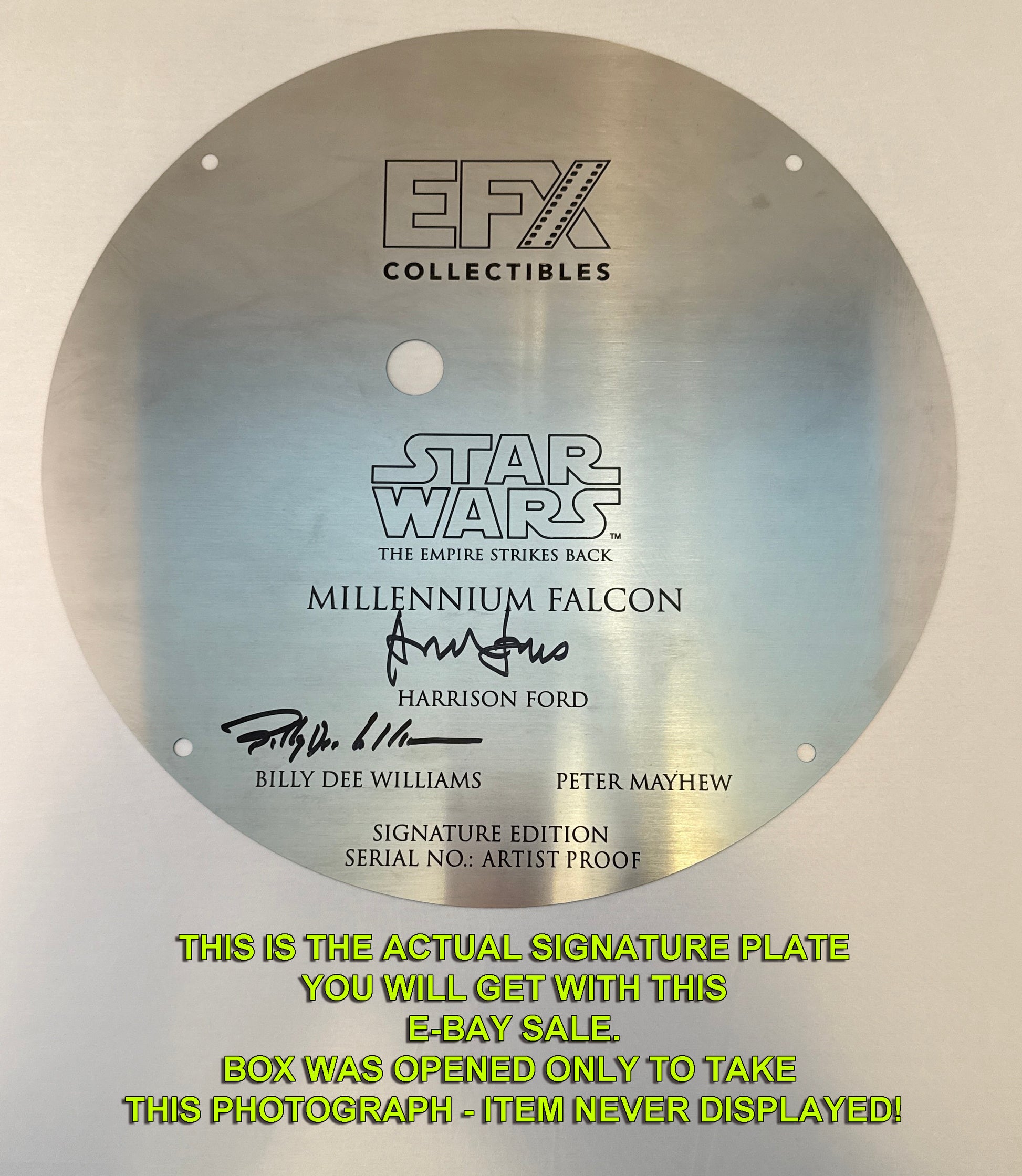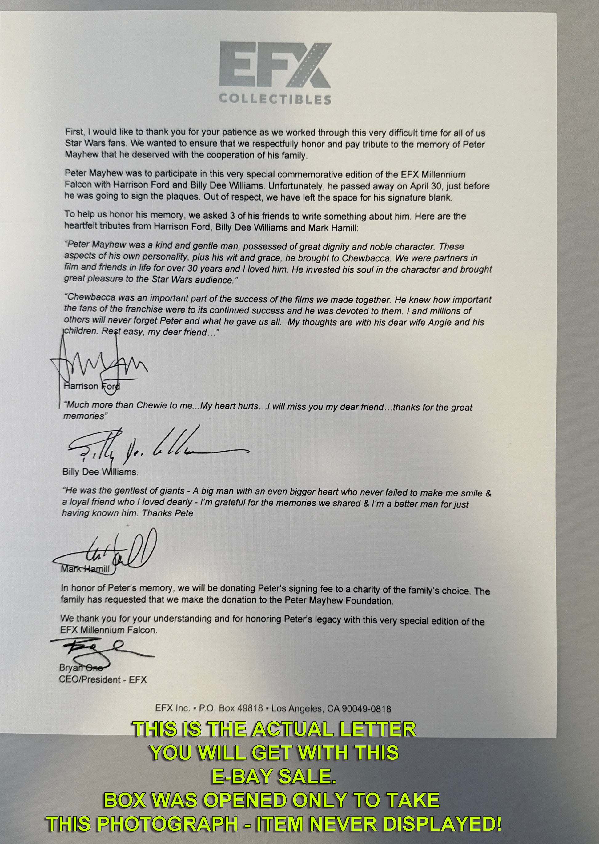 The signature edition was originally intended to be signed by all three actors: Harrison Ford (Han Solo) & Billy Dee Williams (Lando Calrissian) and Peter Mayhew (Chewbacca). Sadly Mr. Mayhew passed away before he could sign his plaques and the space was left empty in his honor. Harrison and Billy Dee each completed their signings and these are 100% hand signed by each of them.