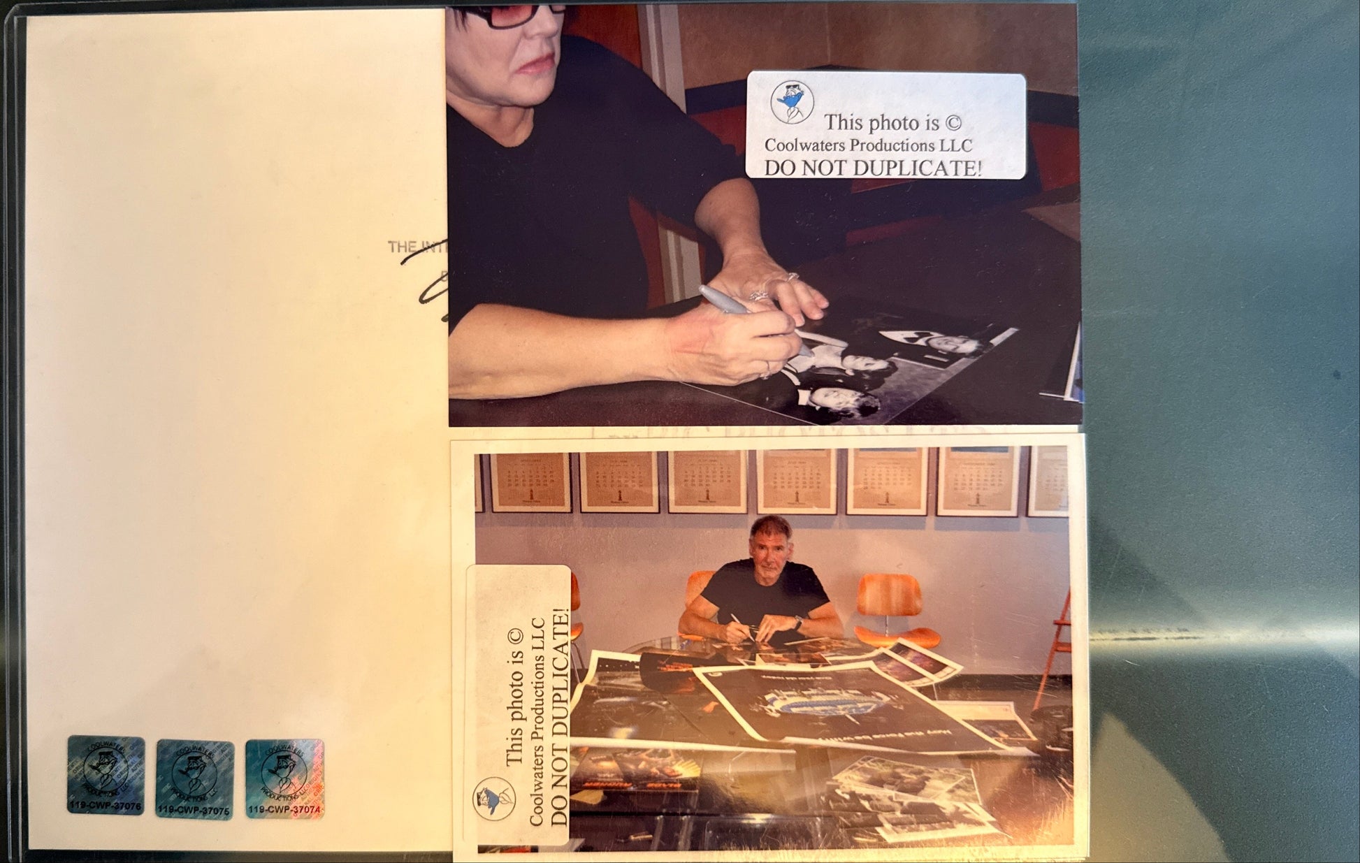If a photo was taken during the signing we will include (as a courtesy) a 4x6 print out, however note that photographs of the celebrity signing the autographs are not always available, however, every single autograph sold on our site comes with a Certificate of Authenticity. COA stickers are typically placed on the back of photos, but some may be on the front. You cannot choose COA sticker placement.